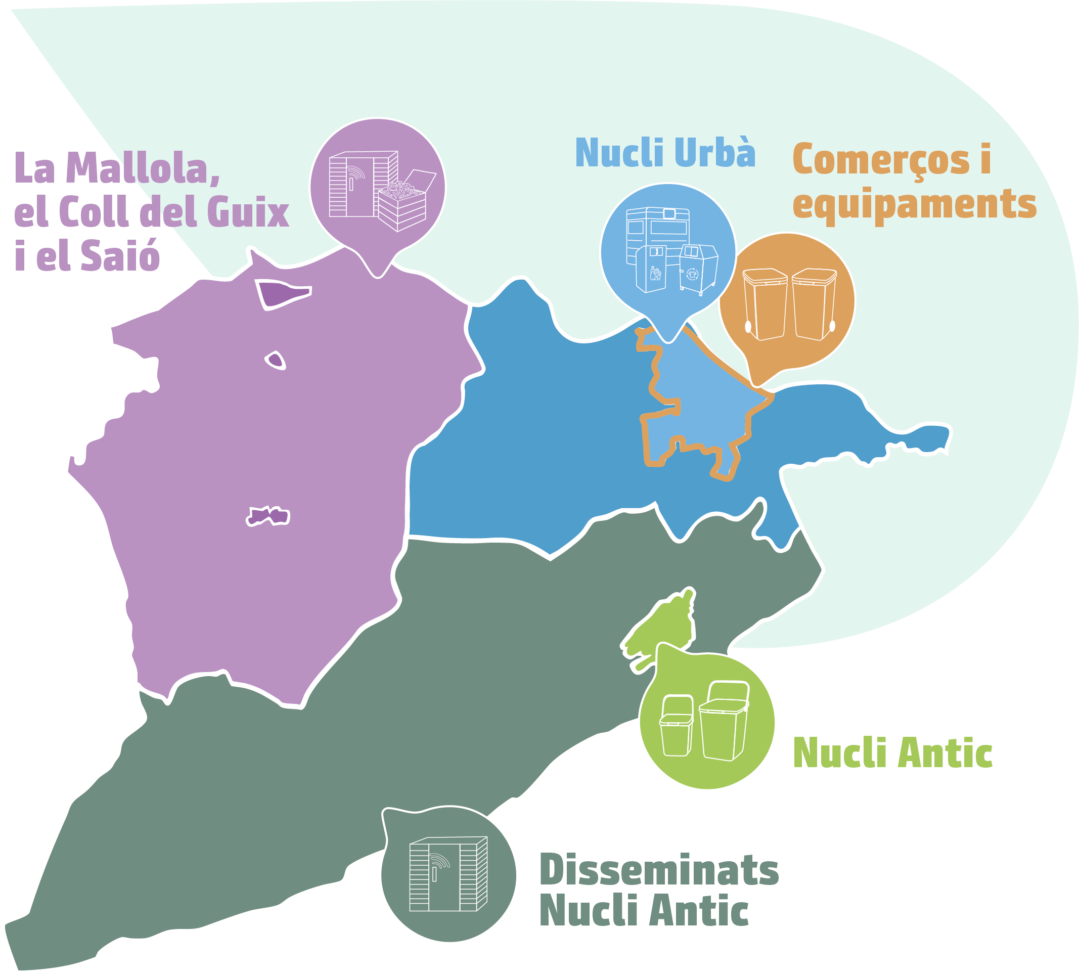UN MODEL ADAPTAT A CADA ZONA DEL MUNICIPI Selecciona la teva zona del municipi i informa't sobre el model de recollida de residus BENEFICIS DELS CANVIS Millorar la separació dels residus, augmentant la quantitat i qualitat del reciclatge. Assolir els objectius de reciclatge establerts per la Unió Europea: el 60% al 2030. Evitar la saturació de les àrees de contenidors. Avançar cap a una taxa de residus més justa, bonificant els habitatges i comerços amb una gestió correcta dels residus.