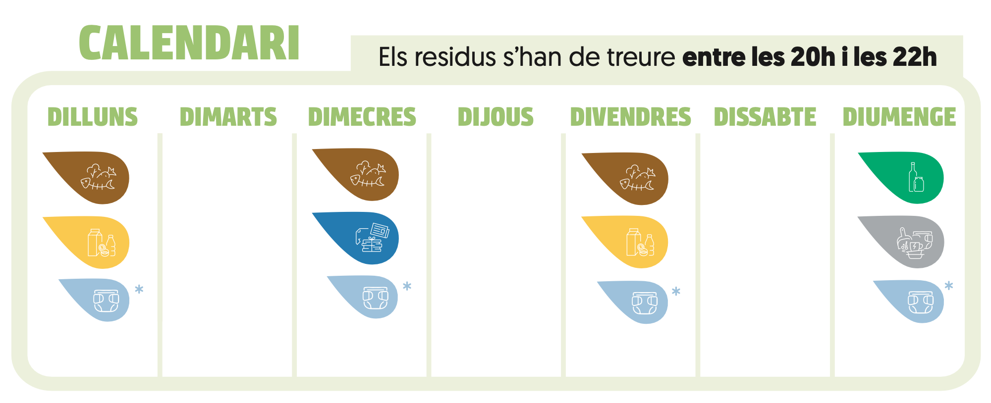 Tèxtil sanitari: diumenge, dins del cubell gris. Els altres dies de recollida, amb bossa tancada i identificada amb l’adhesiu que es pot recollir al Punt d’informació.